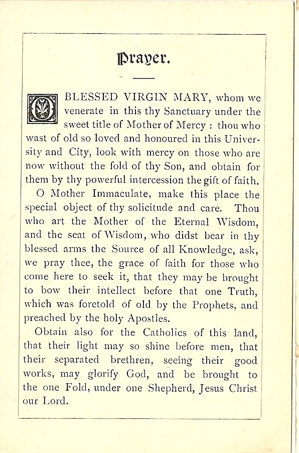 A prayer card survives from the early twentieth century which begins with this special prayer: O Blessed Virgin Mary, whom we venerate in this thy Sanctuary under the sweet title of Mother of Mercy: thou who wast of old so loved and honoured in this University and City …