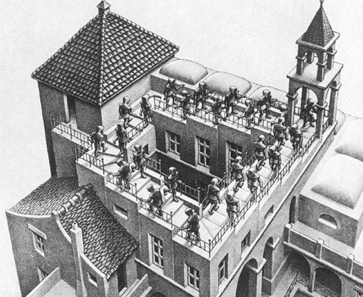 This realisation that humans never really change is a source of constant amazement to me. I am hardly unusual in that when I read John Henry Newman for the first time, I felt like I had met a friend; his life looked in many ways like mine, his concerns about the church (both as an Anglican and a Catholic) were the same ones I see bandied around The Tablet and at the Newman dinner table; the Oxford he describes is in essence still very much the Oxford I know. Newman, I feel, had a strong sense that the lines providence draws around us often resemble an MC Escher painting, connecting in ways that are implausible yet somehow inevitable. One step enough for me, he says. Lead thou me on. I hear those lines echoed in the notes he made on the back cover of his school exercise book between the ages of eleven and eighty-three: And now on the way to Greek. And now in my rooms at Oriel College. Led on by God’s hand blindly, not knowing whither He is taking me. And now a Cardinal. Time drives on, like some relentless and baffling spiral staircase. There’s a certain sense of awe in reading these notes, watching the staircase wind round and round through the decades of his life, and now beyond, folding him into the choir of saints whose lives revolved and unfolded around the same axis. You could keep writing: and now beatified, and now a saint, and now Doctor of the Church. And now patron of some 20 something who, like me, swore she’d never become Catholic. The lives of the saints are prolepsis and analepsis rolled together. Lead Kindly Light taps into something of that elusive substrate of human experience, that wandering in the desert and around perpetually ascending staircases. There’s another essay in here about the linear cycle of doctrinal development (as Terry Eagleton so acerbically puts it, ‘moving from one state of certainty to another state of certainty’), but that’s for another dinner table conversation where everything is the same and yet entirely different to the last time, or the time before that.